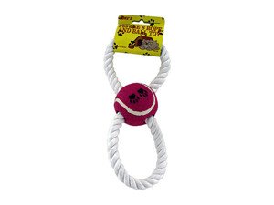 This figure-eight rope and ball dog toy is a fun way to exercise your pet! Item is made from sturdy rope and has a hot pink tennis-like ball in it's center. Item is packaged with a hang tag. Measures 10" long and the ball diameter is 2 1/4".