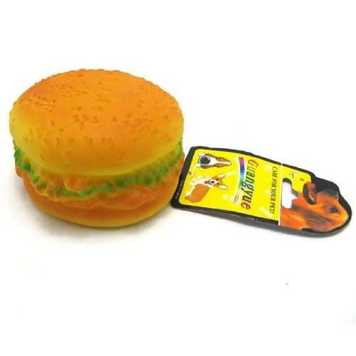 Made of durable and non-toxic platic vinyl, this squeaky hamburger for pets is the perfect cheweable squeaky toy you will find. Designed with real round hamburger appearance (almost), it enables your pet to chew it with great interest without getting fast food sick. This item is accommodated for small and medium dogs as well as cats. It will certainly entertain your pet and keep his or teeth healthy.